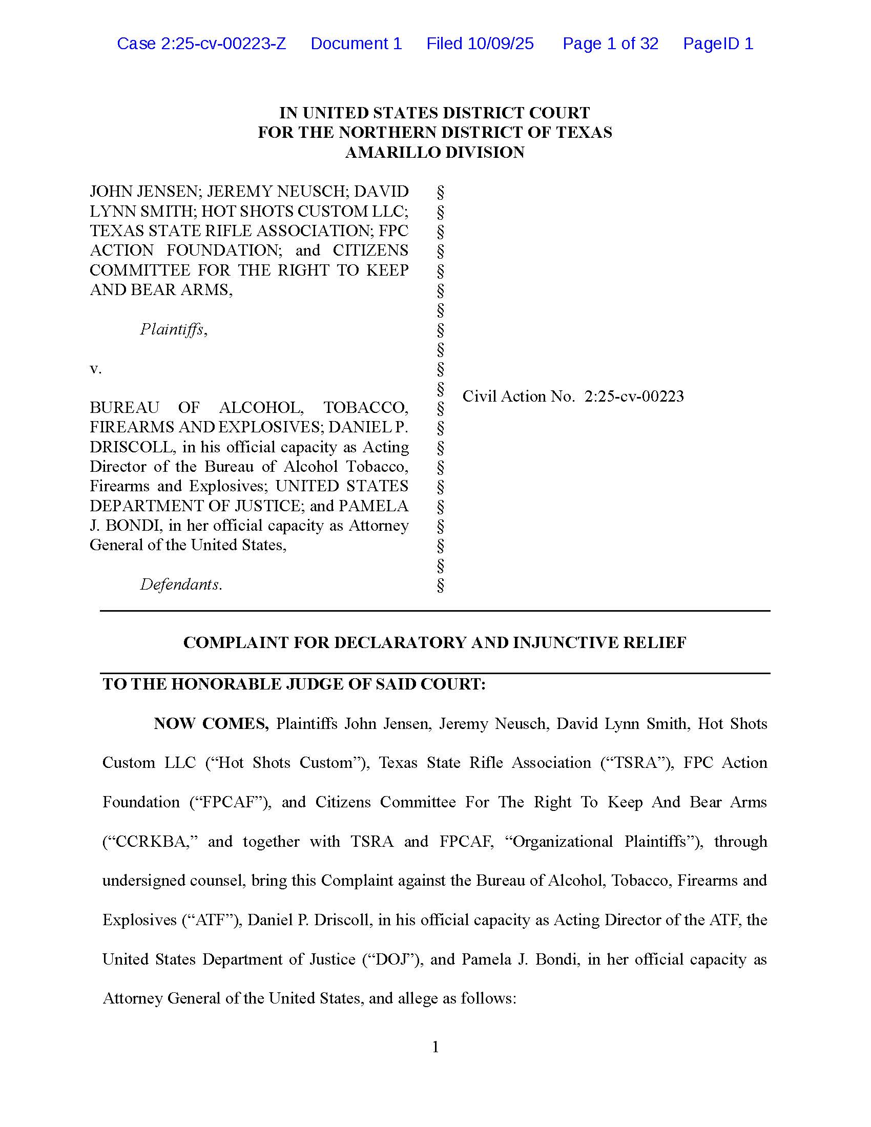 On October 8, 2025, a coalition of four leading gun rights organizations comprised of the American Suppressor Association (ASA), National Rifle Association (NRA), Second Amendment Foundation (SAF), and Firearms Policy Coalition (FPC), announced the filing of a second joint federal lawsuit in the District of Texas challenging the constitutionality of the National Firearms Act (NFA). In 1937, the Supreme Court ruled that the NFA was primarily a revenue-generating measure and the registration requirements of the statute served to verify who had paid the required tax. With the tax rate of $0 as part of the One Big Beautiful Bill, the constitutionality of requiring suppressor owners to register with the federal government is no longer valid. This litigation joins Brown v. ATF, Anderson v. Raoul, and Padua v. Platkin, the ASA Foundation and Silencer Shop—backed lawsuits challenging the constitutionality of the ban on suppressors in Illinois and New Jersey, at the forefront of pro-suppressor litigation.